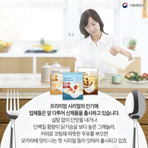 프리미엄 시리얼의 인기에 업체들은 앞 다투어 신제품을 출시하고 있습니다. 설탕 없이 단맛을 내거나 단백질 함량이 닭가슴살 보다 높은 그래놀라, 커피로 코팅돼 따뜻한 우유를 부으면 모카라떼 맛이 나는 핫 시리얼 등이 잇따라 출시되고 있죠.