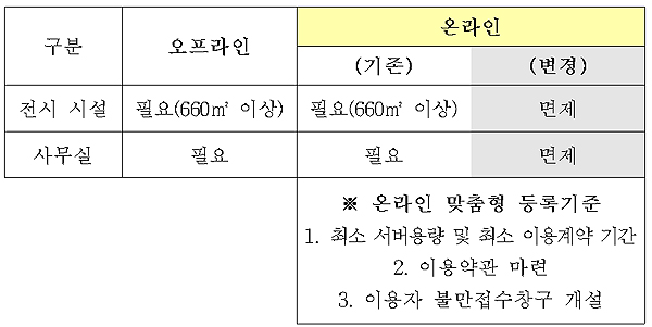 그간 온라인으로만 중고차 매매알선을 하는 사업자도 오프라인 매매업자와 동일하게 자동차 전시시설, 사무실 마련을 위해 불필요한 비용을 지출하거나 심지어 창업을 포기하는 사례가 발생했다.