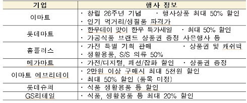 이마트, 홈플러스, 롯데마트 등 대형마트와 기업형 수퍼마켓도 식품과 대형가전, 패션잡화를 중심으로 할인행사를 진행한다.