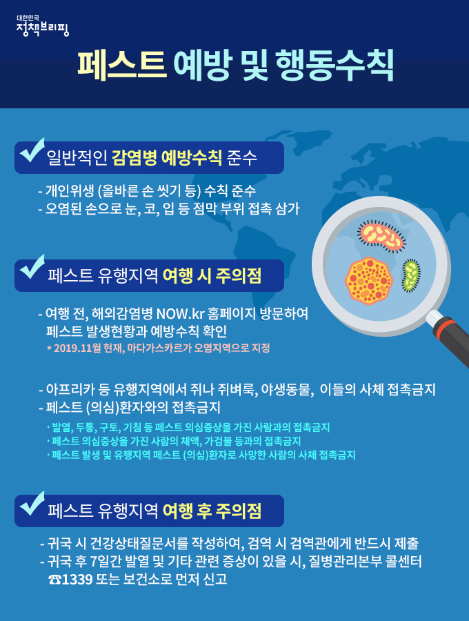 국내 유입 가능성은 낮지만 페스트 유행지역을 방문할 경우에는 페스트균에 감염된 벼룩에 노출될 수 있으므로 감염되지 않도록 주의가 필요하다.