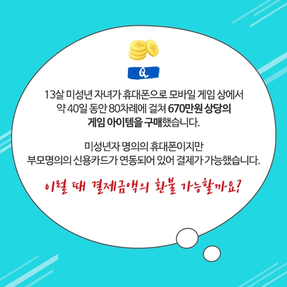 Q. 13살 미성년 자녀가 휴대폰으로 모바일 게임 상에서 약 40일 동안 80차례에 걸쳐 670만원 상당의 게임 아이템을 구매했습니다.