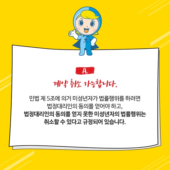 민법 제 5조에 의거 미성년자가 법률행위를 하려면 법정대리인의 동의를 얻어야 하고, 법정대리인의 동의를 얻지 못한 미성년자의 법률행위는 취소할 수 있다고 규정되어 있습니다.