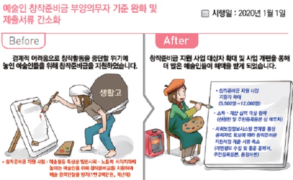 창작준비금 지원 사업의 대상자가 현행 5500명에서 1만 2000명으로 2배 이상 확대된다. 신청자 본인과 배우자의 소득·재산만으로 심의를 거치도록 부양의무자 기준이 완화된다.