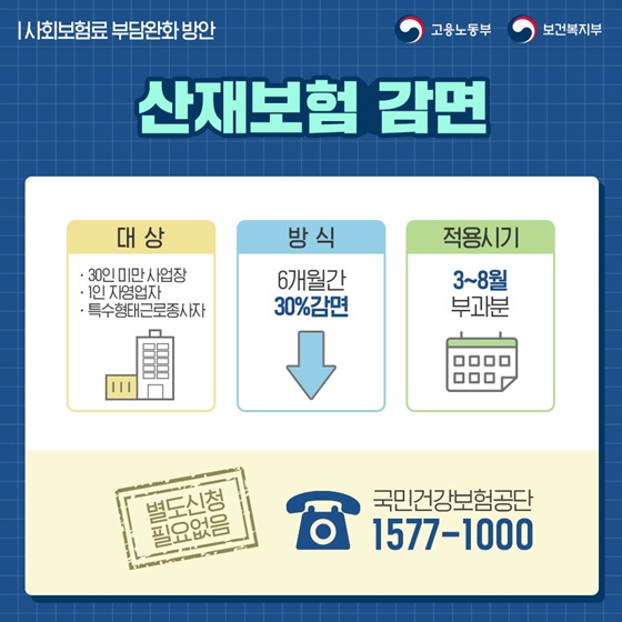 - 건강보험·산재보험 보험료 30% 감면(3~6개월간)
