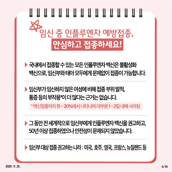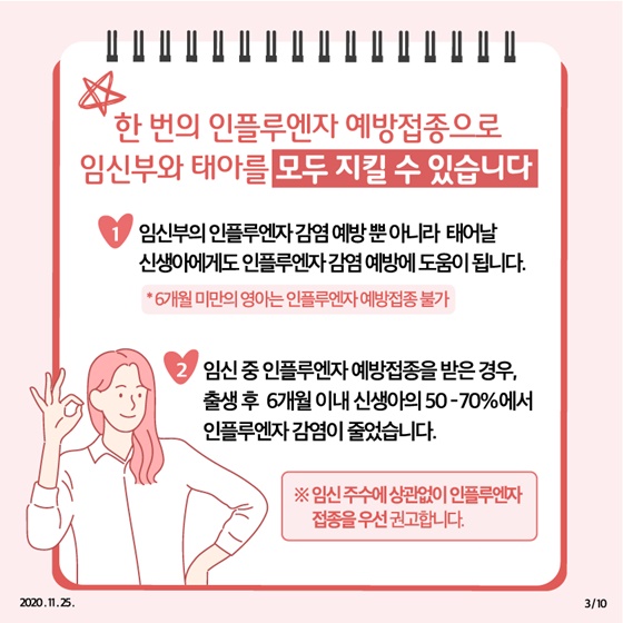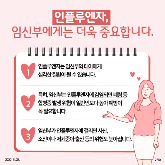 2. 특히, 임신부는 인플루엔자에 감염되면 폐렴 등 합병증 발생 위험이 일반인보다 높아 예방이 꼭 필요합니다.
