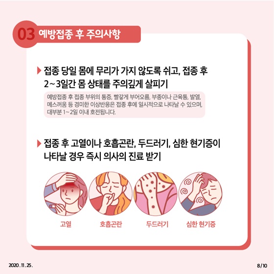 - 접종 당일 몸에 무리가 가지 않도록 쉬고, 접종 후 2~3일간 몸 상태를 주의깊게 살피기
