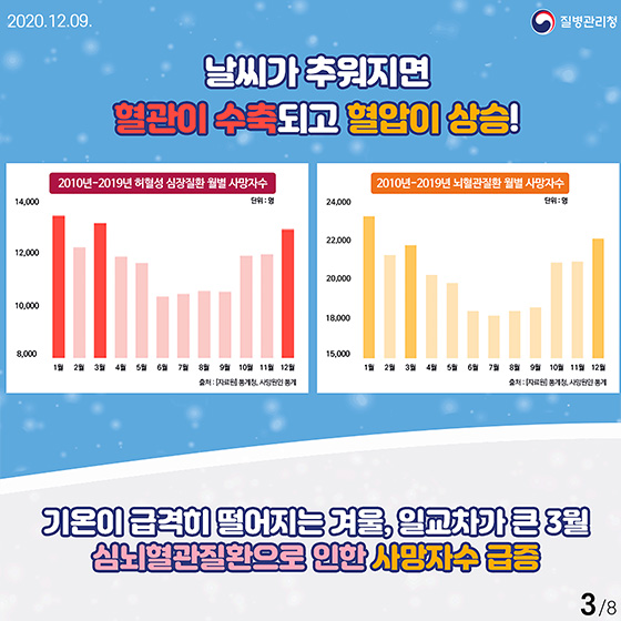 기온이 급격히 떨어지는 겨울, 일교차가 큰 3월 심뇌혈관질환으로 인한 사망자수 급증