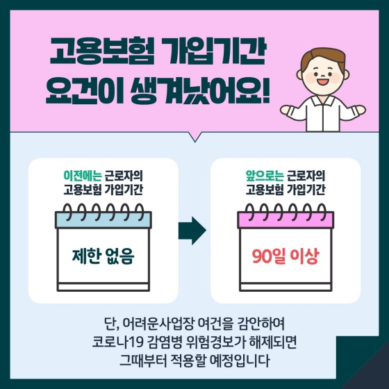- 앞으로는 근로자의 고용보험 가입기간 = 90일 이상