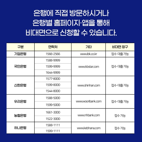 ◆ 은행에 직접 방문하시거나 은행별 홈페이지·앱을 통해 비대면으로 신청할 수 있습니다.