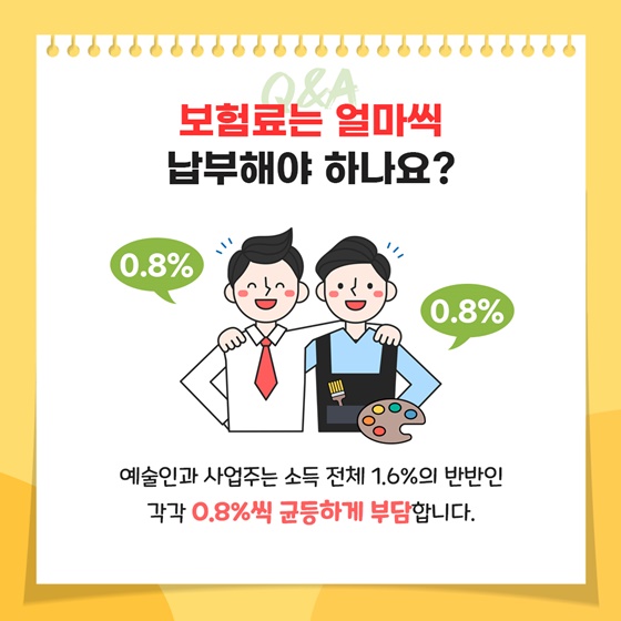예술인과 사업주는 소득 전체 1.6%의 반반인 각각 0.8%씩 균등하게 부담합니다.
