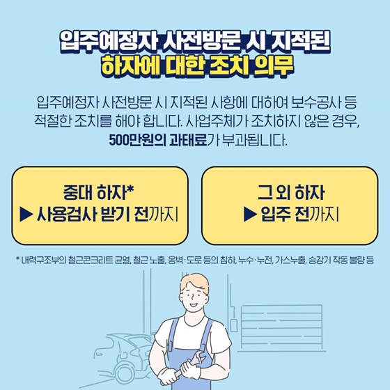 사업주체는 입주예정자 사전방문 시 지적된 사항에 대하여 중대한 하자*는 사용검사를 받기 전까지, 그 외의 하자는 입주 전까지 보수공사 등 적절한 조치를 해야 합니다.