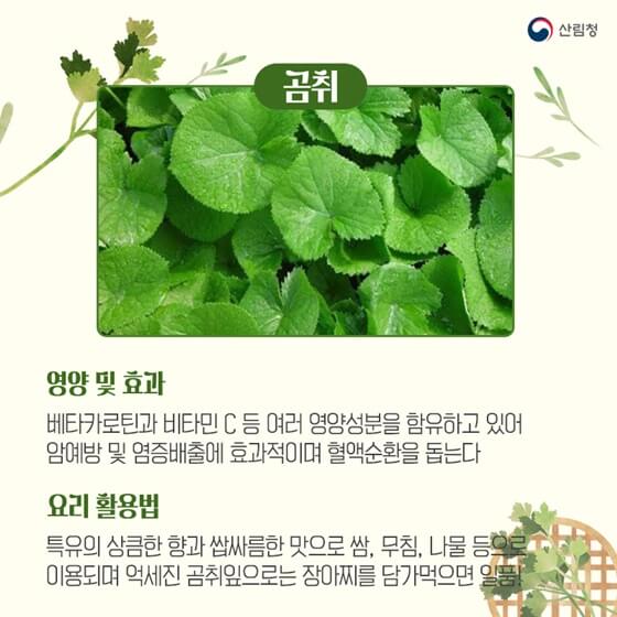 -요리 활용법 : 특유의 상큼한 향과 쌉싸름한 맛으로 쌈, 무침, 나물 등으로 이용되며 억세진 곰취 잎으로는 장아찌를 담가먹으면 일품