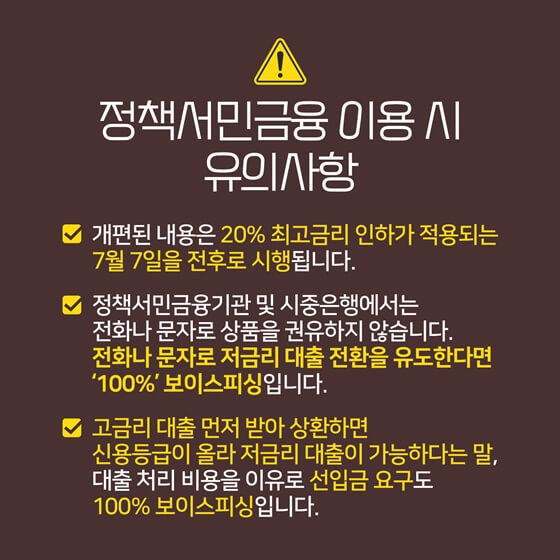 -정책 서민금융기관 및 시중은행에서는 전화나 문자로 상품을 권유하지 않습니다. 전화나 문자로 저금리 대출 전환을 유도한다면, ‘100%’ 보이스피싱입니다.