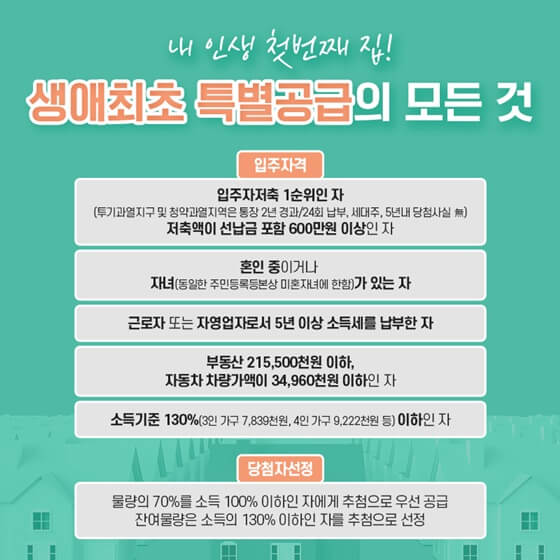 특정 조건을 갖춘 국민에게 주택 공급을 지원하는 제도로 신혼부부, 생애최초 등이 해당됩니다.