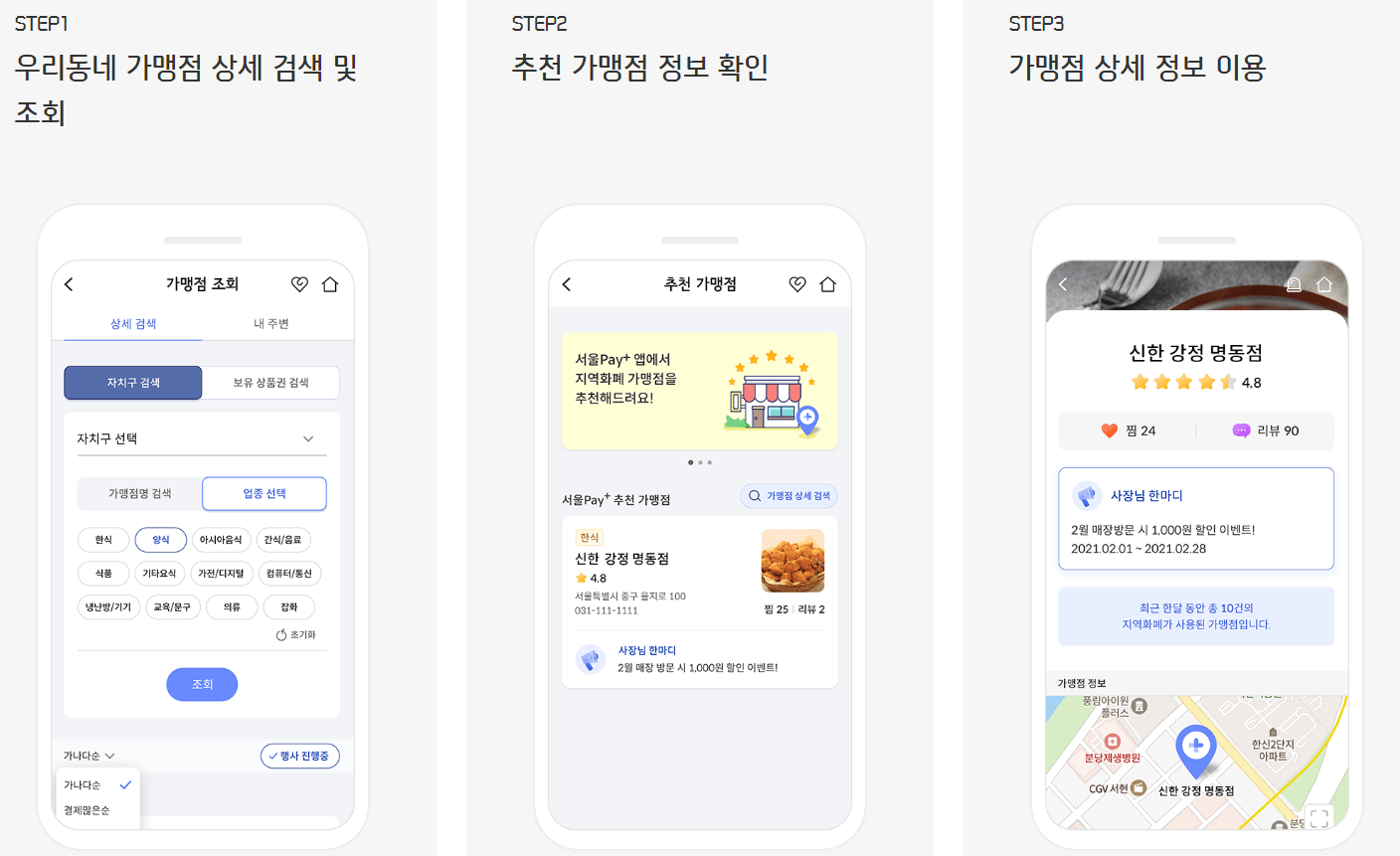 우리동네 가맹점조회와 AI가 추천해주는 가맹점 목록을 볼 수 있고 이용한 가맹점 별점 주기, 후기 등록, 즐겨찾기를 할 수 있습니다.