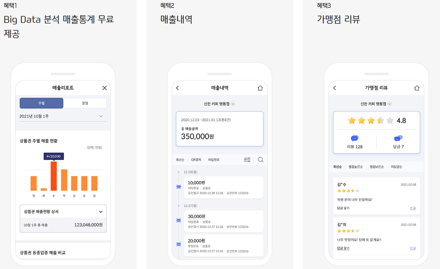 - 가맹점 리뷰관리, 가맹점 사진등록, 사장님 한마디(가맹점 홍보) 등록기능이 있습니다.