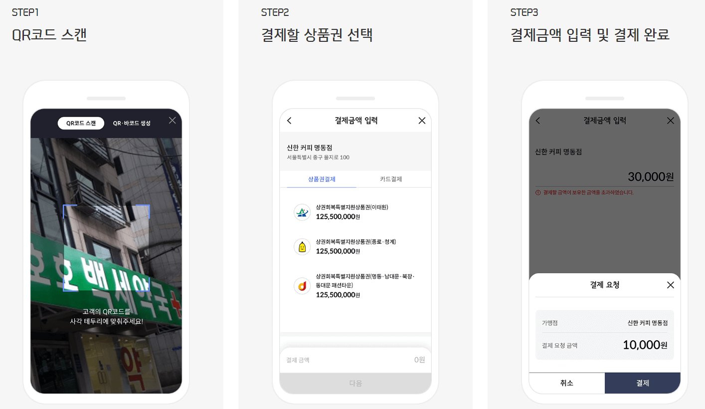 - 방법 2: 이용고객의 폰으로 생성한 QR을 가맹점에 제시하면 가맹점에서 스캔하여 상품권을 사용합니다.