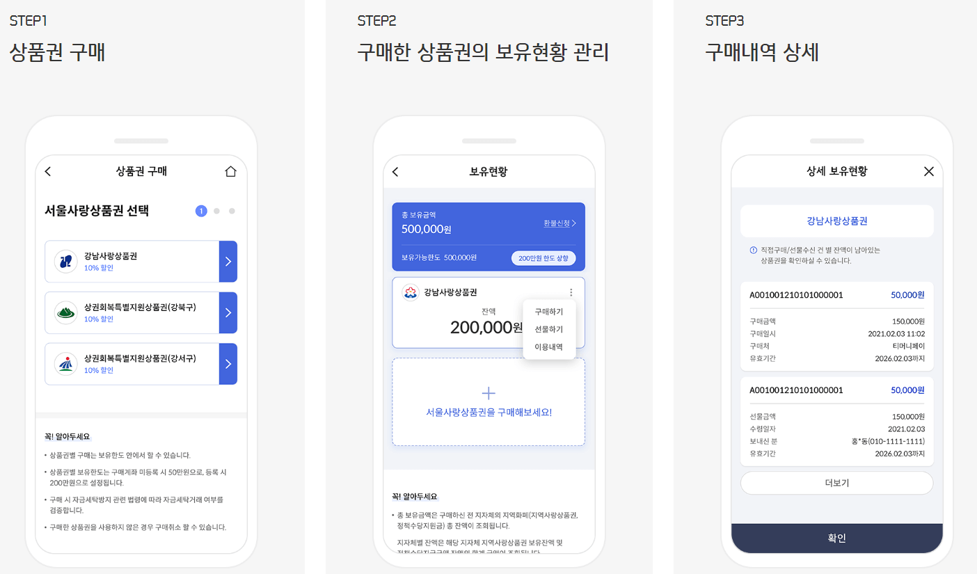 - 구매한 상품권은 서울Pay+, 신한SOL, 티머니페이, 머니트리 앱에서 결제 가능합니다.