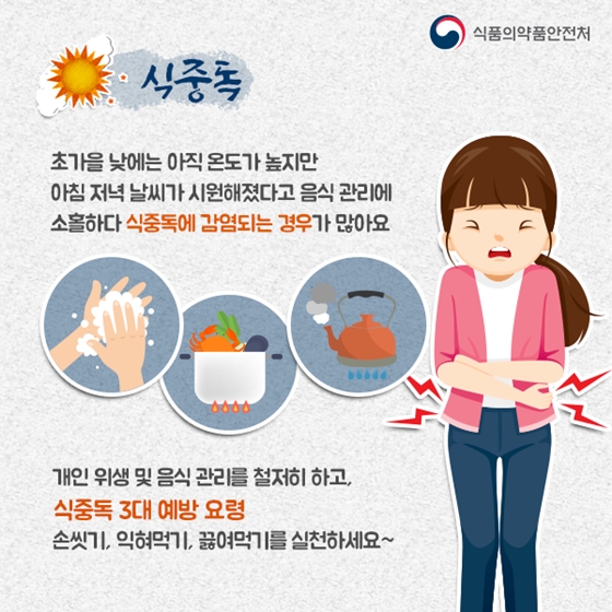 초가을 낮에는 아직 온도가 높지만 아침저녁 날씨가 시원해졌다고 음식 관리에 소홀하다 식중독에 감염되는 경우가 많아요. 개인위생 및 음식 관리를 철저히 하고, 식중독 3대 예방 요령 손 씻기, 익혀 먹기, 끓여 먹기를 실천하세요.