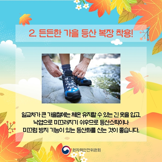 일교차가 큰 가을철에는 체온 유기할 수 있는 긴 옷을 입고, 낙엽으로 미끄러지기 쉬우므로 등산스틱이나 미끄럼 방지 기능이 있는 등산화를 신는 것이 좋습니다.