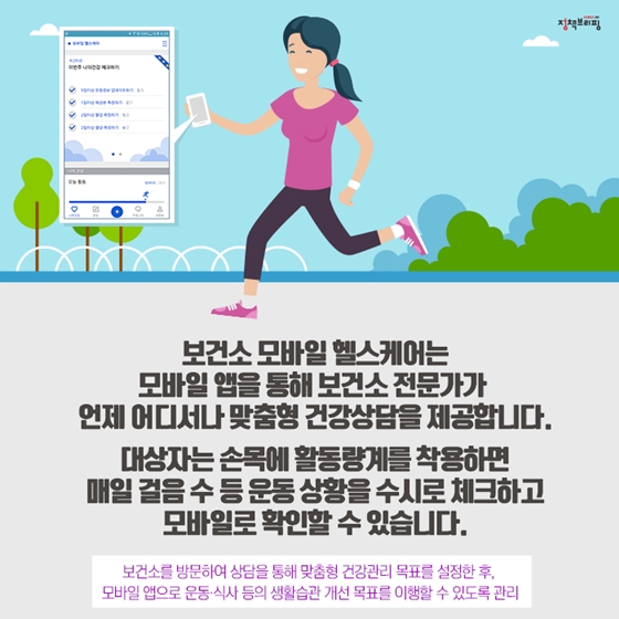 보건소 모바일 헬스케어는 모바일 앱을 통해 보건소 전문가가 언제 어디서나 맞춤형 건강상담을 제공합니다. 대상자는 손목에 활동량계를 착용하면 매일 걸음 수 등 운동 상황을 수시로 체크하고 모바일로 확인할 수 있습니다.