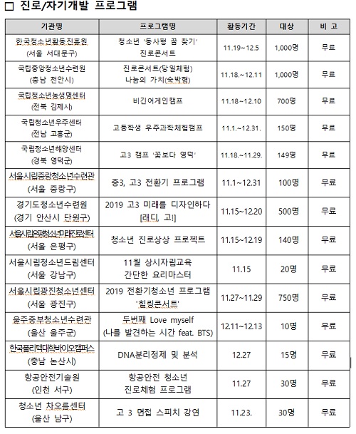 국립청소년수련시설 4개소에서는 고등학교 3학년 청소년을 위해 국립수련원 청소년 체인지업 진로캠프를 운영한다.