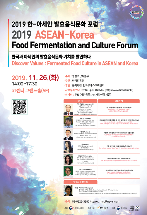 같은 날 전 세계 식품 트렌드로 떠오르는 발효음식을 주제로 ‘2019 한-아세안 발효음식문화 포럼’도 열린다.