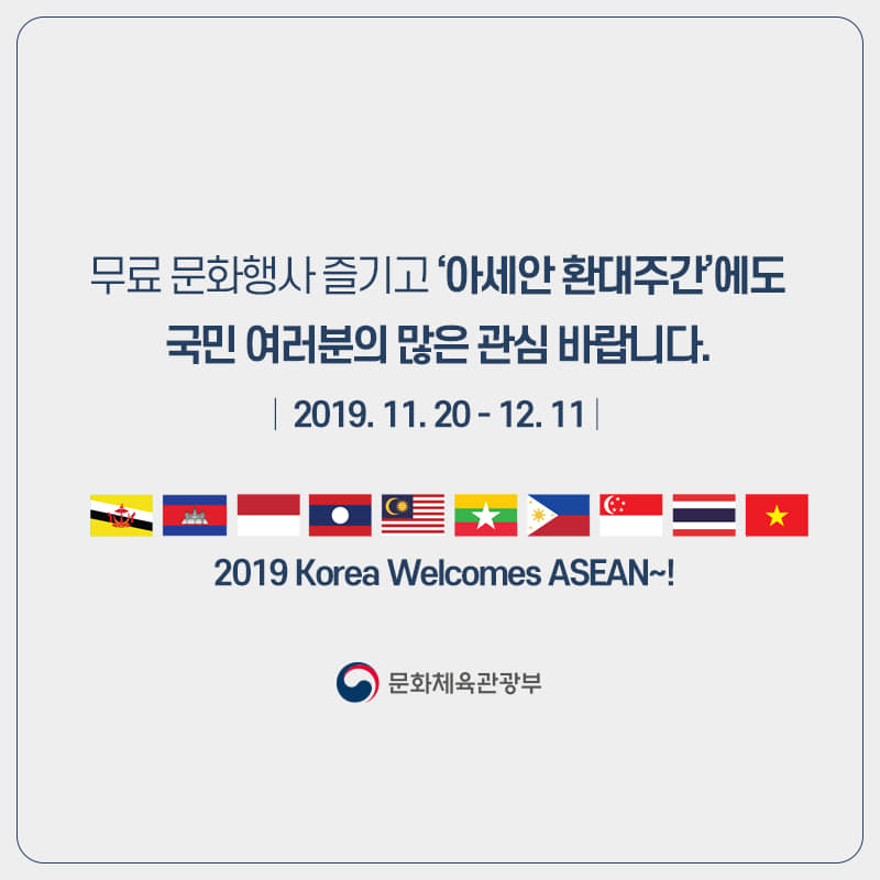 무료 문화행사 즐기고 아세안 환대주간에도 국민 여러분의 많은 관심 바랍니다.