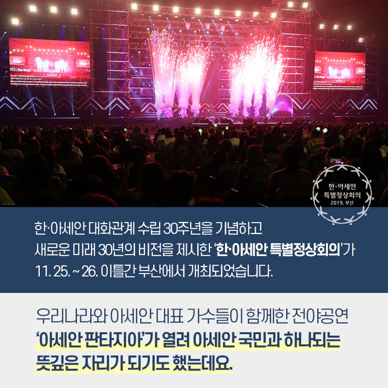 우리나라와 아세안 대표 가수들이 함께한 전야공연 ‘아세안 판타지아’가 열려 아세안 국민과 하나되는 뜻깊은 자리가 되기도 했는데요.
