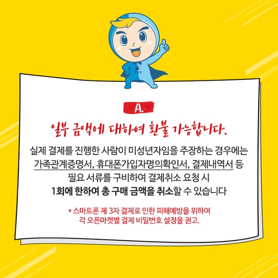 실제 결제를 진행한 사람이 미성년자임을 주장하는 경우에는 가족관계증명서, 휴대폰가입자명의확인서, 결제내역서 등 필요 서류를 구비하여 결제취소 요청 시 1회에 한하여 총 구매 금액을 취소할 수 있습니다.