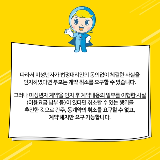 그러나 미성년자 계약을 인지 후 계약내용의 일부를 이행한 사실(이용요금 납부 등)이 있다면 취소할 수 있는 행위를 추인한 것으로 간주, 동계약의 취소를 요구할 수 없고, 계약 해지만 요구 가능합니다.