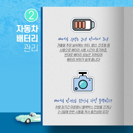 겨울철 추운 날씨에는 히터, 열선, 전조등 등 사용으로 배터리 사용 시간이 증가하죠. 반대로 배터리 성능은 저하되어 배터리 부하가 쉽게 옵니다!
