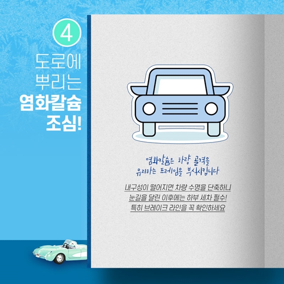 염화칼슘은 차량 골격을 유지하는 프레임을 부식시킵니다. 내구성이 떨어지면 차량 수명을 단축하니 눈길을 달린 이후에는 하부 세차 필수! 특히 브레이크 라인을 꼭 확인하세요.