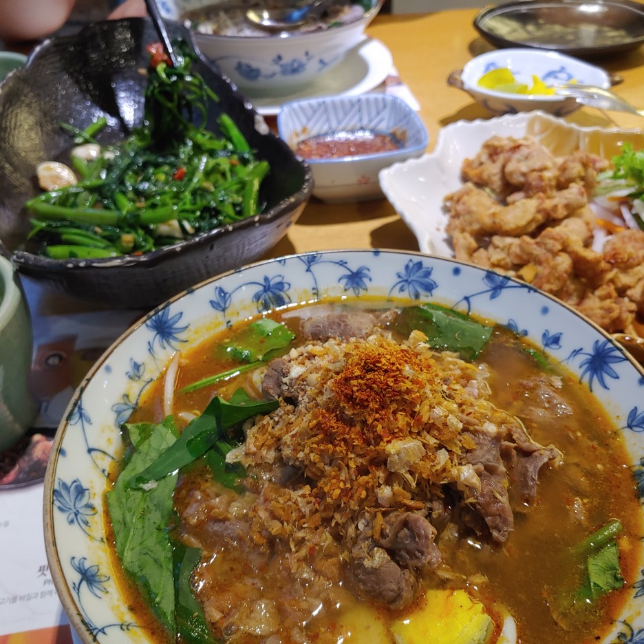 베트남 쌀국수에 비해 면이 더 얇고 국물향이 찐하고 간이 더 쌘 느낌이다.