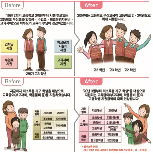 ▲고등학교 무상교육 단계적 확대 실시=2019년 2학기 고등학교 3학년부터 시행 중인 고등학교 무상교육이 올해에는 고등학교 2·3 학년으로 확대 시행된다. 지원항목은 입학금·수업료·학교운영지원비·교과서비 등으로, 이에 따라 고등학생 1인당 연간 약 158만원의 학비부담을 덜어줄 것으로 예상된다.