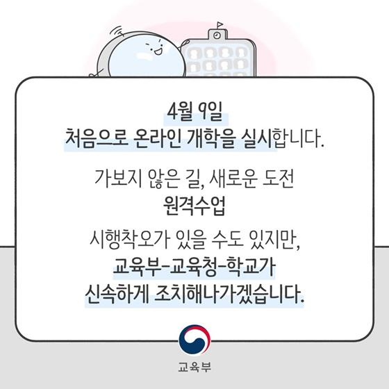 4월 9일 처음으로 온라인 개학을 실시합니다. 가보지 않은 길, 새로운 도전 원격수업. 시행착오가 있을 수도 있지만, 교육부-교육청-학교가 신속하게 조치해나가겠습니다.