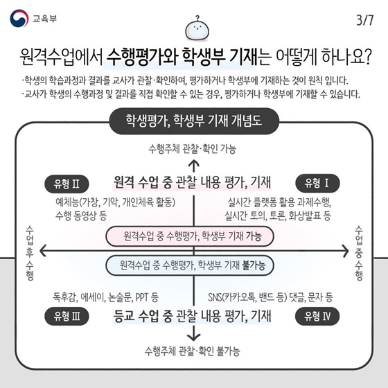 * 원격수업 중 교사의 직접 관찰이 가능한 경우(유형 Ⅰ·Ⅱ), 학생의 수행과정 및 결과에 대해 평가하거나 학교생활 기록부에 기재할 수 있습니다.