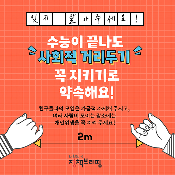 수능이 끝나도 “사회적 거리두기” 꼭 지키기로 약속해요!