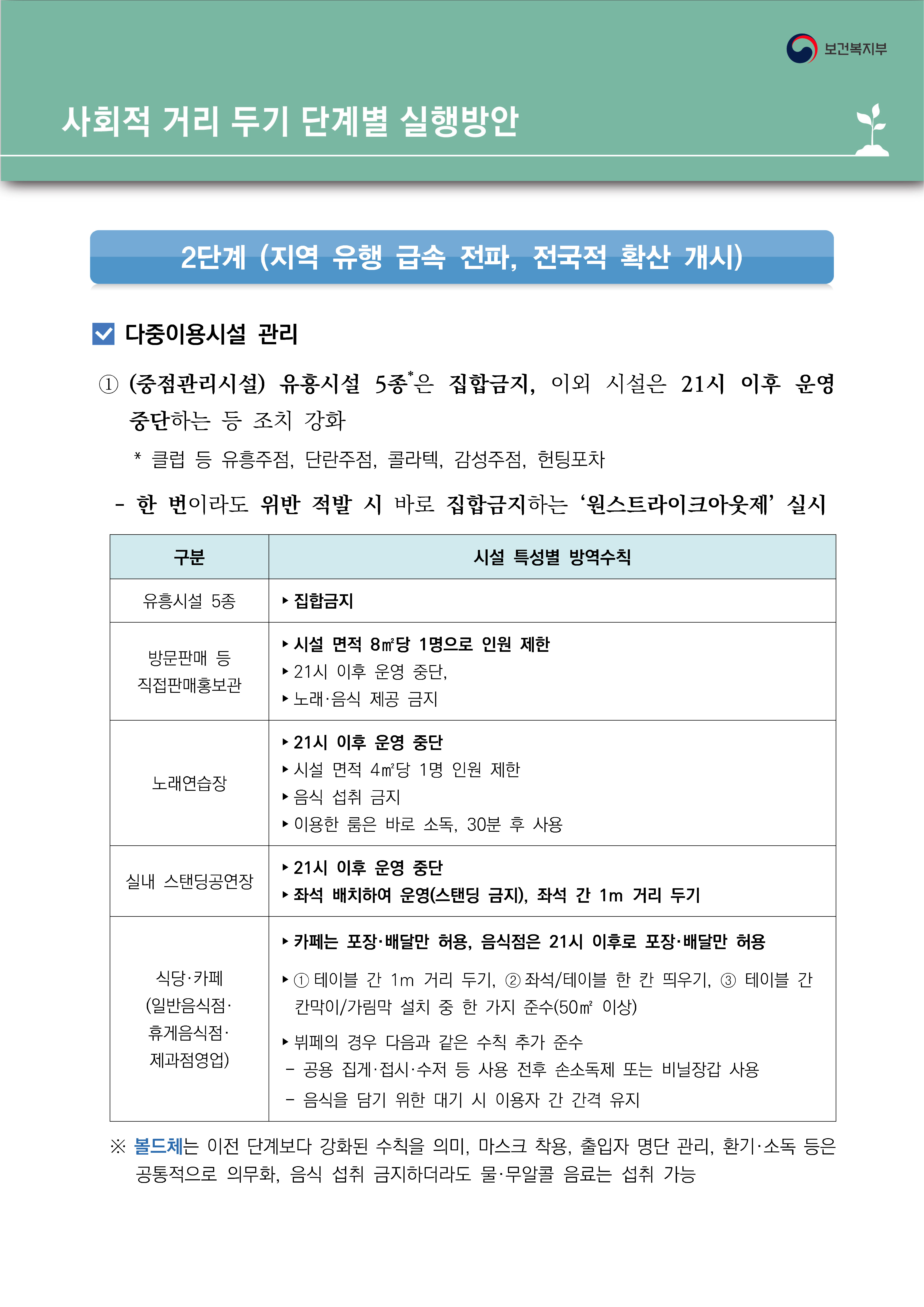 이외 시설은 21시 이후 운영 중단 등 제한 강화, 위반 시 원스트라이크아웃제 |