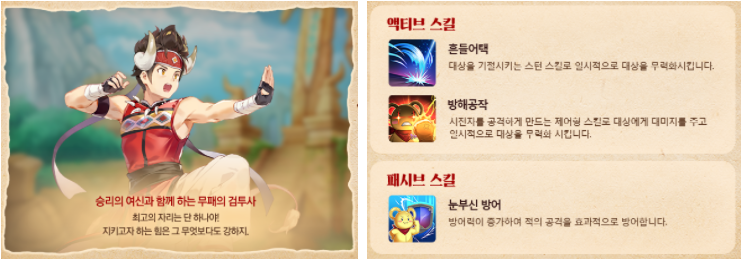 액티브 스킬에는 '겔더 던지기'와 '끈기있는 용병'가 있으며 패시브 스킬에는 '체력 훈련'과 같은 스킬이 포함됩니다.