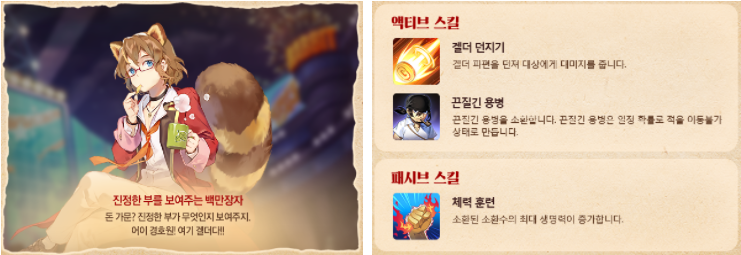 대상에게 피해를주고 일정 확률로 움직이지 못하게하고 대상에게 피해를주고, 대상을 잡았을 때 추가 피해를주는 원거리 타입 자체에 집중하는 캐릭터입니다.