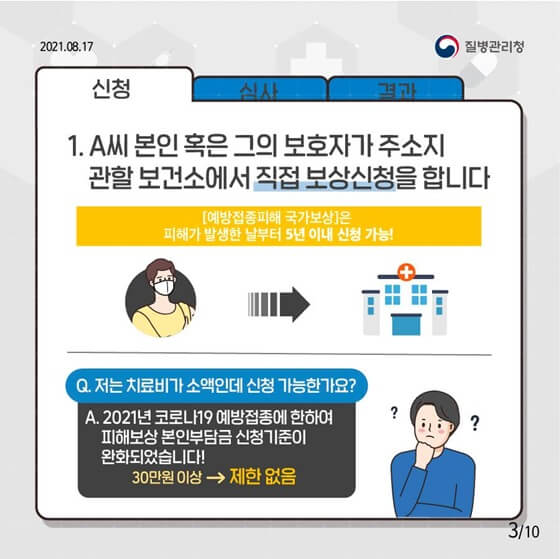 1. A씨 본인 혹은 그의 보호자가 주소지 관할 보건소에서 직접 보상 신청을 합니다.