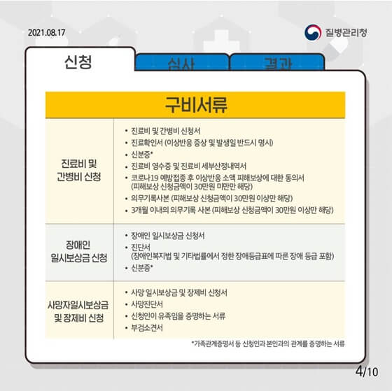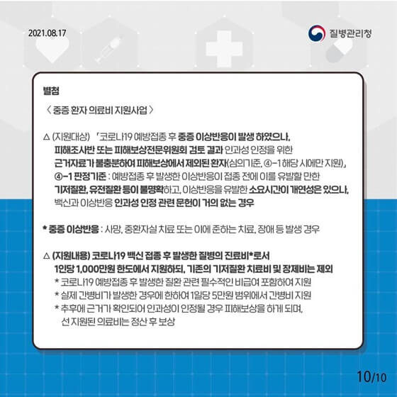 - 자세한 정보는 질병관리청 누리집을 방문하여 <코로나19 예방접종 후 이상반응 발생 시 인과성 근거가 불충분한 중증 환자 의료비 지원> 카드 뉴스를 확인하세요!