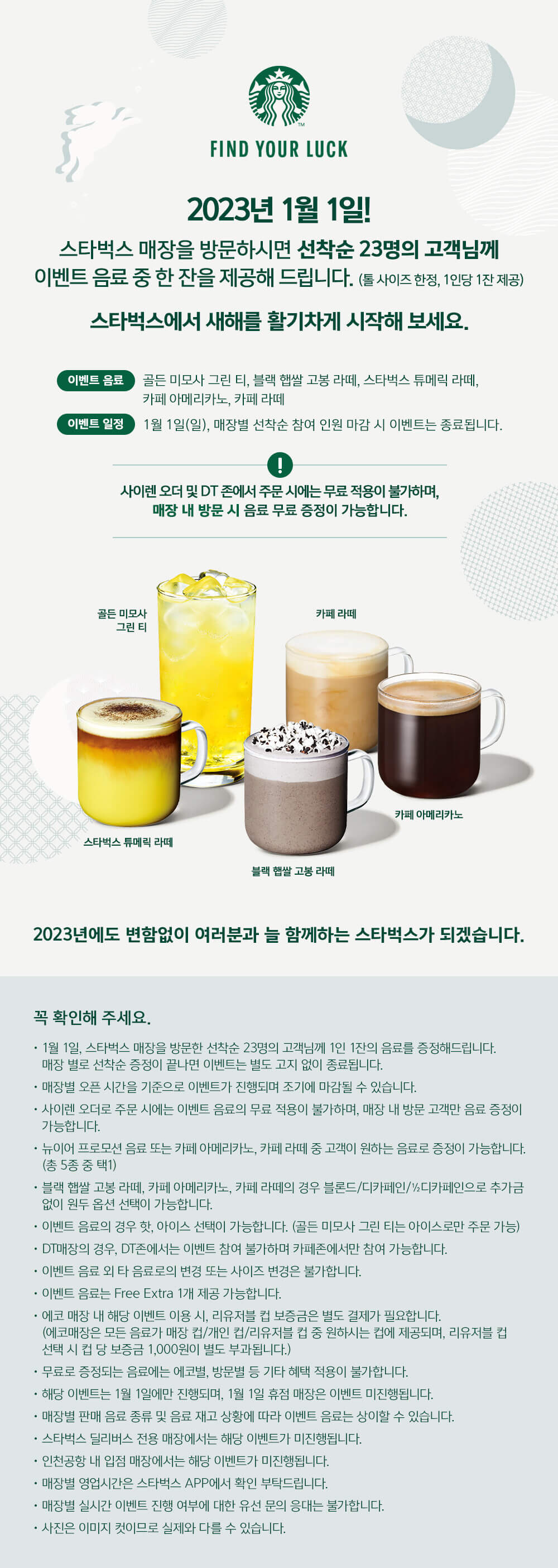 그리고 [FIND YOUR LUCK] 슬로건에 맞춰, 매장별로 1월 1일에 방문한 선착순 23명에게 이벤트 음료 5종 중 1잔(톨 사이즈)을 무료로 제공하는 새해 이벤트를 진행