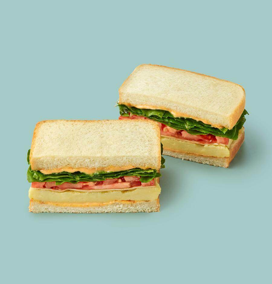 비건 오믈렛(Vegan Omelet 식물성 대체 오믈렛), 로메인 상추(Lettuce-Romane), 토마토(Tomato)를 넣어 만든 샌드위치로 지구를 위한 이유 있는 편식, Plant Based Food입니다.