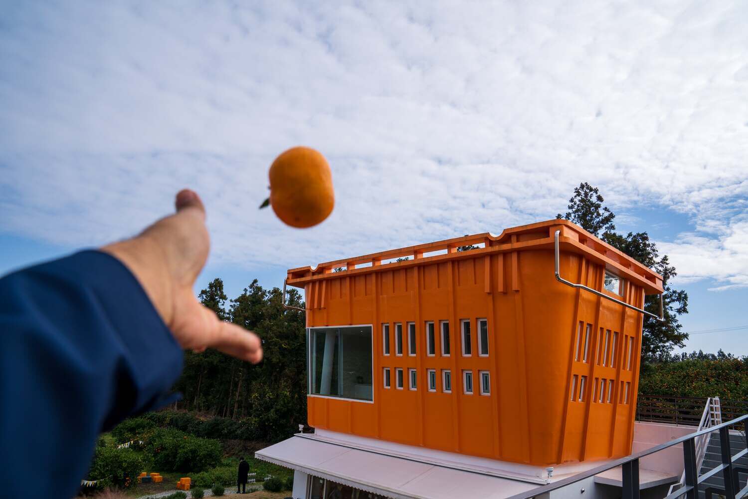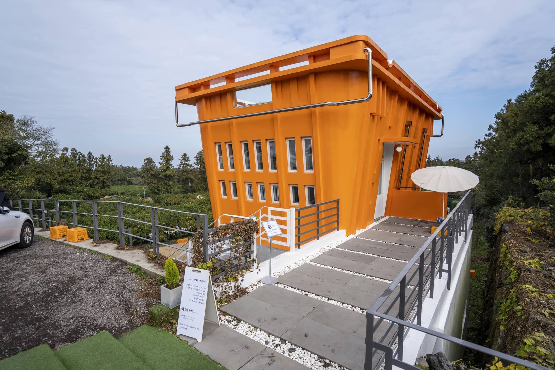 더 콘테나는 귤창고를 개조해서 만든 이색 카페인 만큼 외관에서부터 독특한 모습을 보여주고 있었어요. 건물 전체가 감귤색(주황색)으로 칠해져있어서 멀리서도 눈에 확 띄는 모습이었답니다. 입구 앞에는 주차장이 마련되어 있어서 편하게 주차 후 입장할 수 있었어요.
